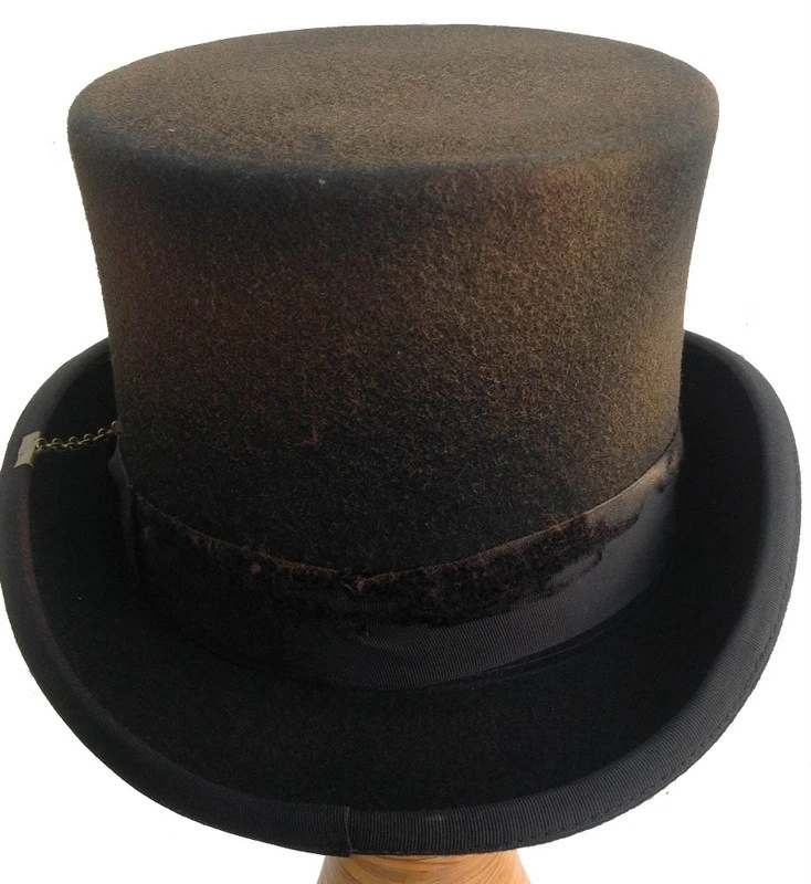 Distressed-Look wool felt Steampunk top hat with chains and Penny-Farthing (High Wheeler) charm.