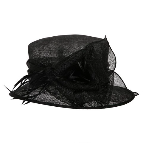 The asymmetric shaped garden party derby hat in sinamay straw sports a flower shaped sinamay bow with goose biot feathers.