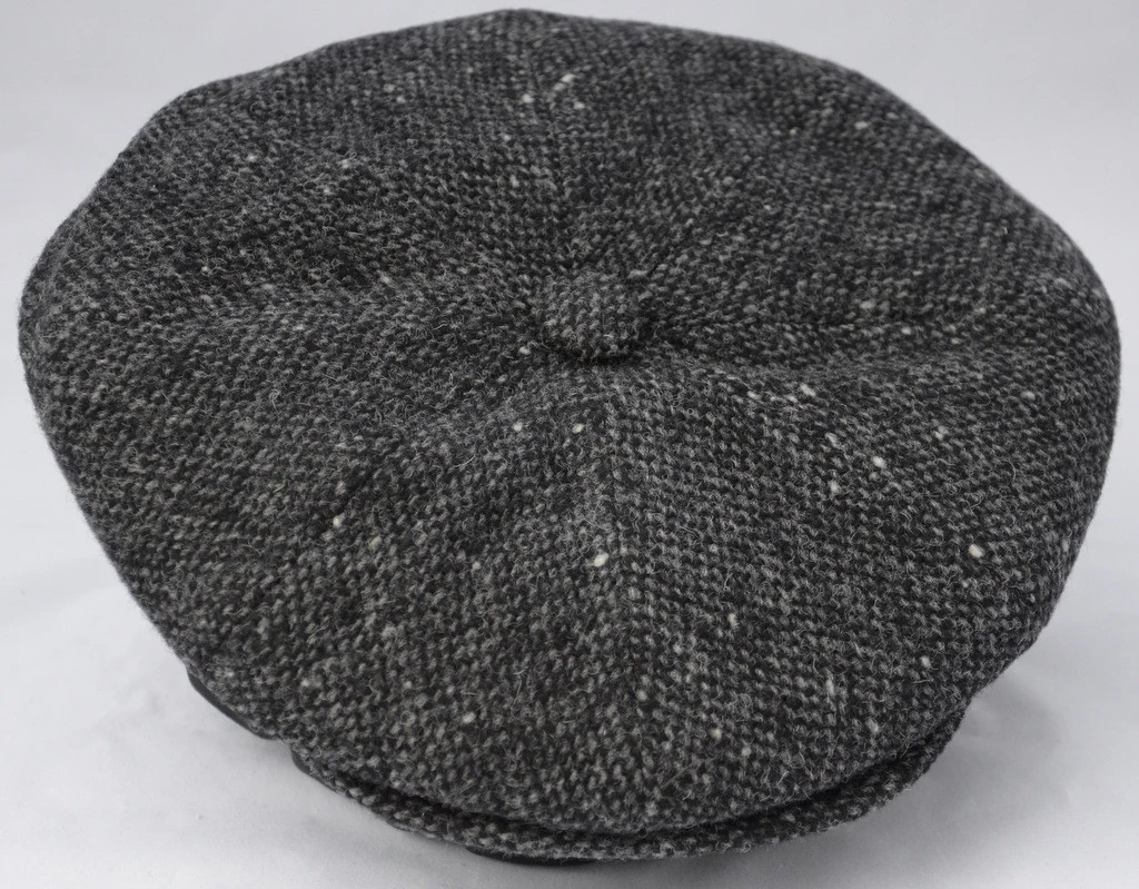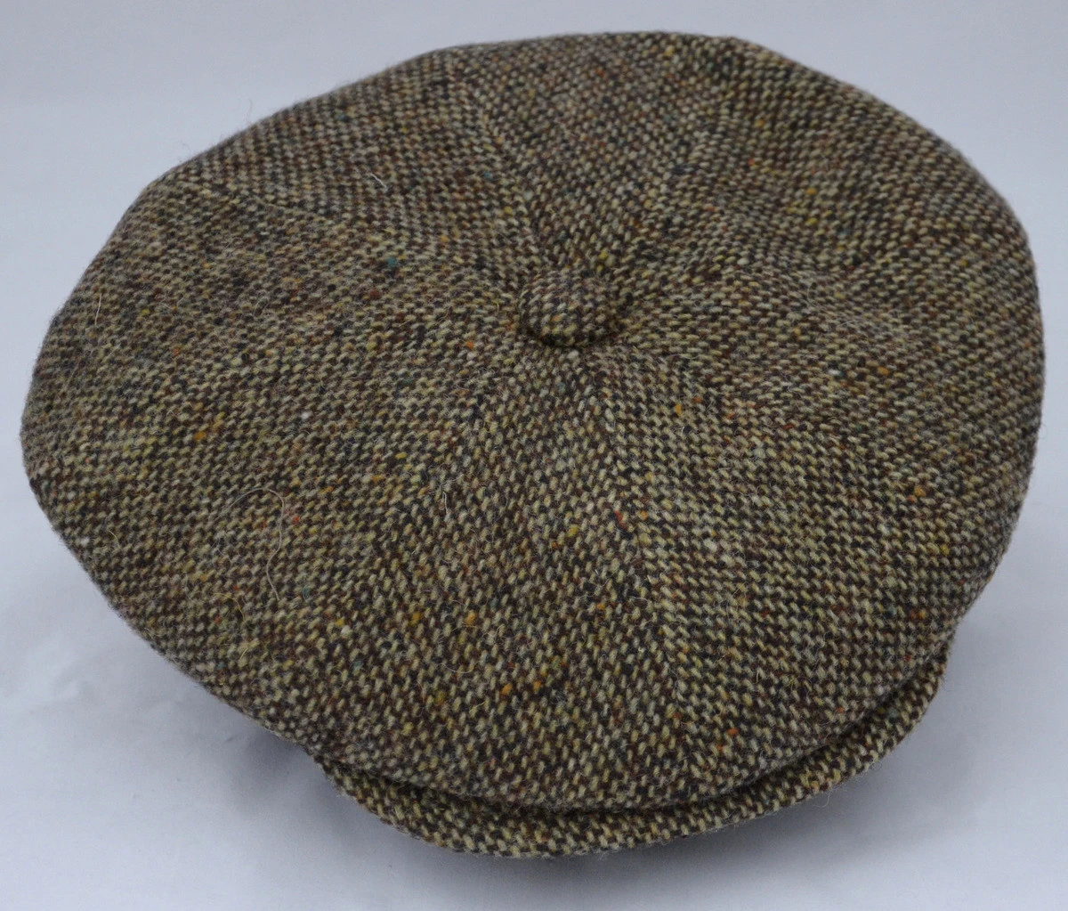 This is a fine cabbie cap in the 8 quarter Gatsby shape of heavy weight Donegal 100% wool tweed.
