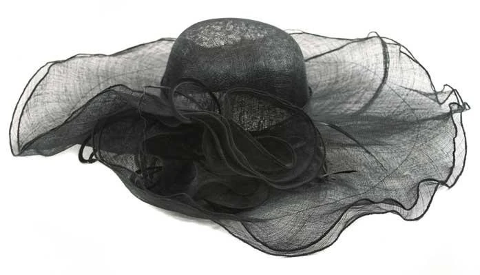Soft sinamay straw derby hat with swirled self colored decorative trim that flows with the shape of the hat.