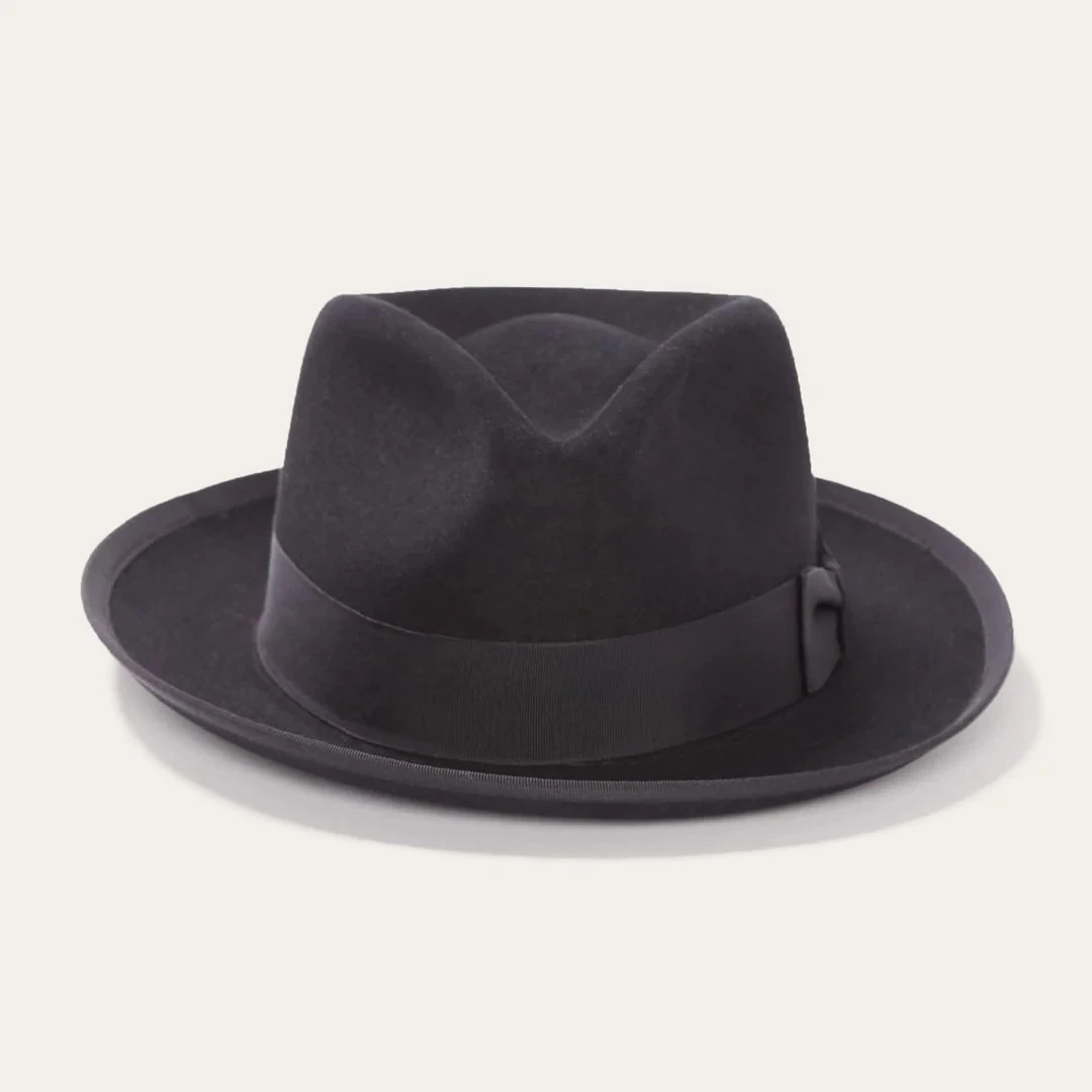The Whippet Fedora is constructed of firm finish, fur felt and features a pinch-front crown, bound edge brim, interior cowhide sweatband and grosgrain hat band with feather accent. Â